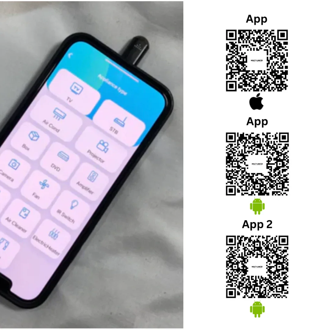 Instala nuestra app con los códigos QR, después conecta el MultiLinker a tu teléfono, vincula el MultiLinker con la app y elige el dispositivo que desees controlar